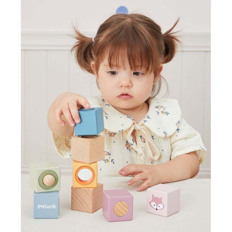 Chaque cube offre une expérience sensorielle différente : surfaces lisses ou texturées en bois ou en tissu, miroir pour se regarder, filtre coloré, effet kaléidoscope, mini billes à écouter, ou encore un poussoir sonore en bois. À la fois blocs de construction à empiler, à aligner ou à combiner, ces 8 cubes en bois invitent les tout-petits à explorer, manipuler et découvrir le monde par les sens.