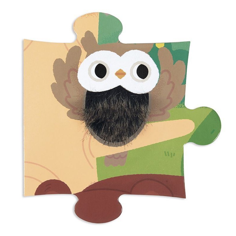 Une fois le puzzle de 20 pièces reconstitué, l’enfant prolonge l’expérience grâce aux 7 pièces tactiles intégrées à la scène. Le dos de l’ours et du daim, la queue du raton laveur et du renard, les ailes de l’oiseau ou encore le corps du hibou offrent autant de surfaces à explorer. Ces éléments invitent l’enfant à découvrir et comparer différentes imitations de textures, à observer, toucher et reconnaître, du bout des doigts, les matières associées au monde animal. Ce puzzle tactile favorise le développement de la motricité fine, la coordination œil-main tout en stimulant le sens du toucher.