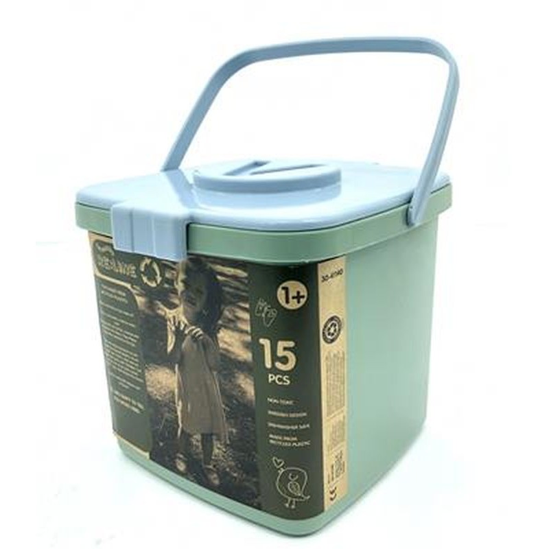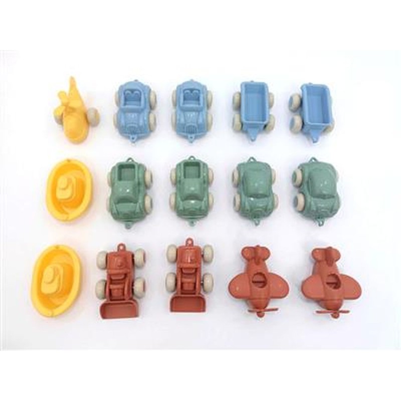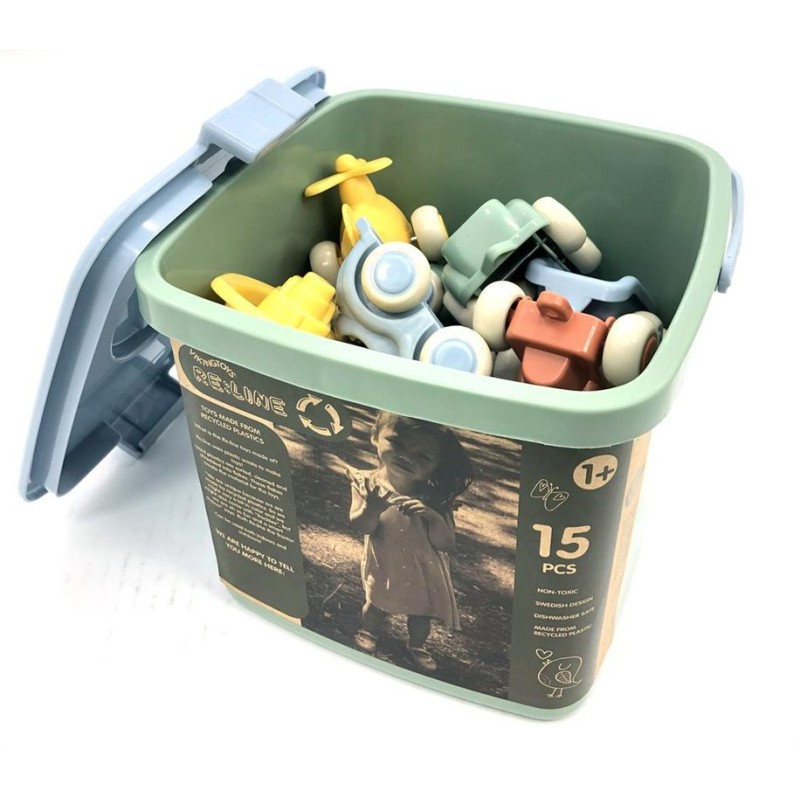 15 véhicules en plastique recyclé dans un baril de rangement, à partir de 1 an.