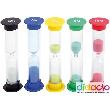 Lot de 5 sabliers pour compléter vos jeux ou animer les jeux créés en classe. Le temps propre à chaque sablier est indiqué sur les 2 extrémités, ce qui est très pratique!