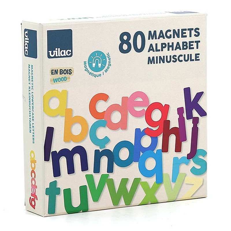 Coffret de 80 lettres minuscules magnétiques en bois pour découvrir l’alphabet, manipuler les lettres et composer ses premiers mots, à partir de 3 ans.