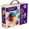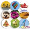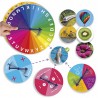 Contenu: 80 tuiles en carton résistant avec des photos (diam. 5 cm), 1 grande roue réversible (diam. 17,3 cm), 3 petites roues dont 1 réversible (diam. 11,5 cm), 10 jetons étoiles (diam. 3 cm), 1 feutre effaçable, guide d'activités non inclus à télécharger sur le site de Didacto (onglet règle de jeu).