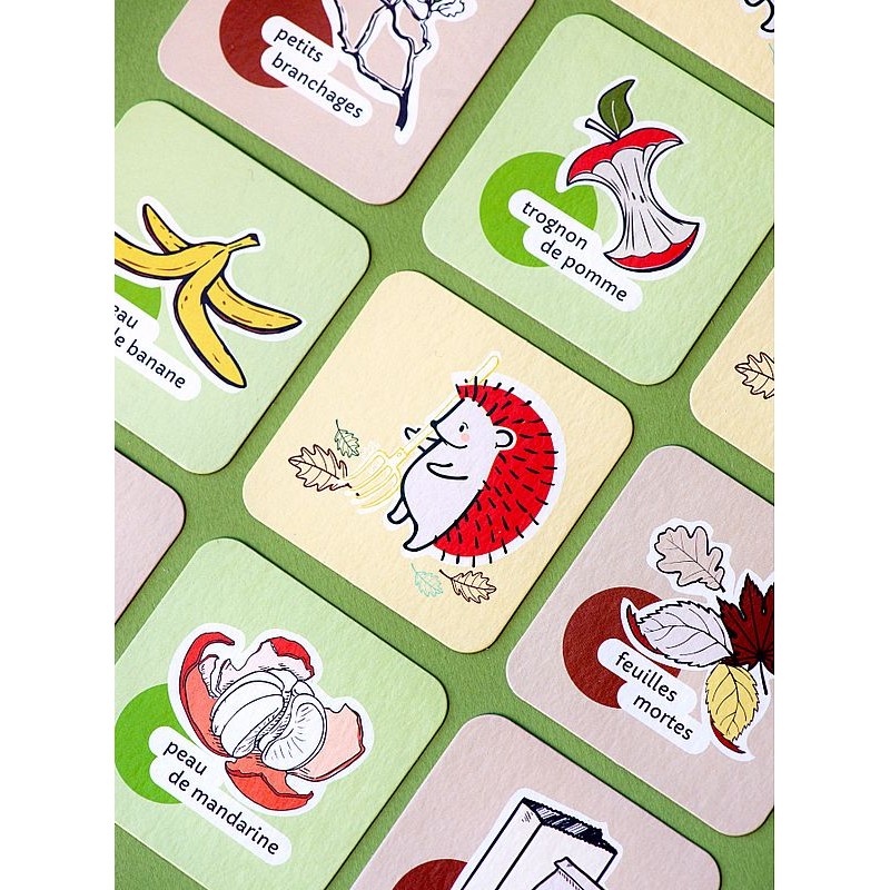 Jeu de défausse pour découvrir les biodéchets et les règles du compostage. On monte le composteur et on le place au centre de la table à côté du camion de recyclage. Chaque joueur à son tour peut mettre une de ses cartes dans le bac à compost en veillant à bien alterner les cartes vertes (déchets humides) et les cartes brunes (déchets secs). La carte joker représente un hérisson qui va aérer le compost. Il peut également lancer le dé qui indiquent différentes actions comme mettre une carte au recyclage, piocher une carte, donner une carte à un autre joueur, etc. Le gagnant est le premier joueur qui n'a plus de cartes en main. Un joli jeu tout simple pour familiariser les enfants avec l'impact écologique des déchets.