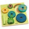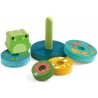 Encastrement et jeu d'empilement dans une même boîte! Les formes en bois sont très épaisses et dépassent largement de la planche d'encastrements. Elles sont faciles à attraper et à empiler. L'enfant peut utiliser la tige pour stabiliser les anneaux. Un jeu évolutif qui sollicite la coordination et la dextérité.
