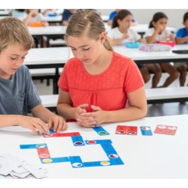 Le jeu propose une progression grâce à un code couleur : les dominos bleus, plus simples, permettent de découvrir les fractions de base et leurs représentations visuelles. Les dominos rouges introduisent des fractions plus complexes ou des équivalences, pour aller plus loin dans la compréhension. Le format domino permet d'appréhender les fractions de manière visuelle et ludique et d'aider les enfants à comprendre ce qu’est une fraction, en les comparant et en identifiant des équivalences (1/2 = 2/4, etc.).