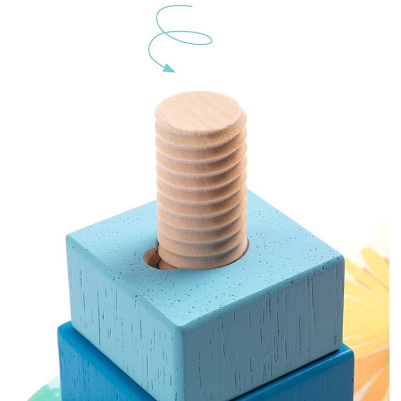 Contenu: 1 base avec des tiges et 9 pièces colorées en bois (8 ,5 x 9,5 x 22,5 cm), dans une boîte de format 10 x 11,5 x 23,5 cm.