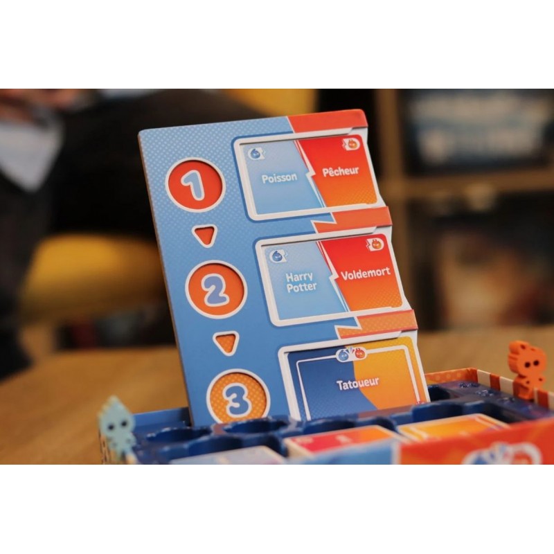 Contenu : 200 cartes Duel recto verso, 100 cartes Binôme recto verso, 1 plaque porte carte, 2 pions Totem, 1 livret avec les règes du jeu dans une boîte cartonnée (14 x 19 x 5 cm) qui sert aussi de support pour compter les points.