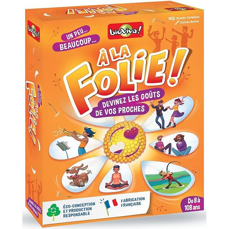 Contenu: 56 cartes réversibles pour 112 activités (6,2 x 8,6 cm), 5 tuiles Repère, 6 tuiles Cœurs de fleur choix, 30 pétales choix,2 cœurs de marguerite À la folie, 15 pétales À la folie, règles et variante, dans une boîte de format 4,5 x 13,7 x 18 cm. Jeu éco-conçu, fabriqué en France!