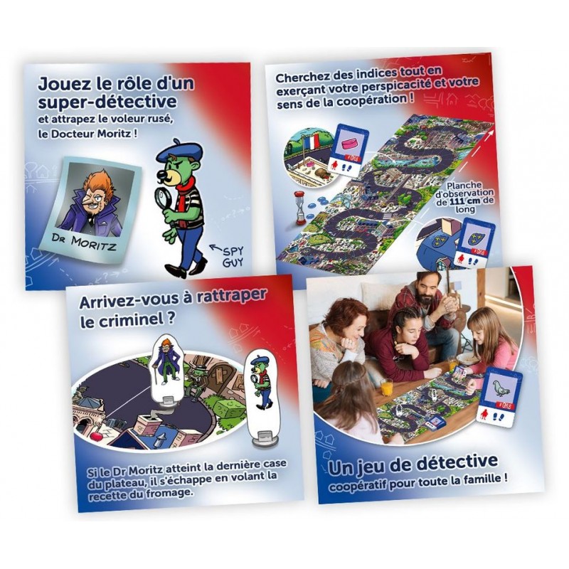 Le cœur du jeu repose sur l’observation et la coopération. L’objectif : permettre à Spy Guy d’arrêter le Dr Moritz avant qu’il ne s’échappe ! À chaque tour, une carte indice est révélée : elle montre un objet à repérer sur le grand plateau de jeu représentant la ville. Chaque objet apparaît plusieurs fois sur le plateau, et les joueurs doivent en retrouver le plus grand nombre possible avant la fin du sablier. Dès qu’un joueur en trouve un, il place un jeton indice dessus. Une fois le temps écoulé, Spy Guy avance d’autant de cases que d’objets retrouvés. Mais attention, le Dr Moritz progresse lui aussi : son déplacement dépend du nombre d’empreintes figurant sur la carte indice. La partie devient alors une véritable course contre la montre entre Spy Guy et le Dr Moritz.