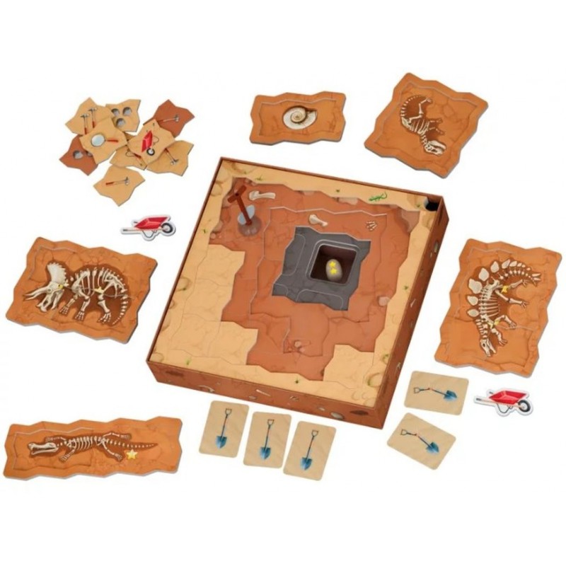 Contenu : 1 terrain de fouille composé de 4 niveaux de profondeur, 11 cartes Pelle recto verso, 1 pelle ventouse, 5 jetons Brouette, 4 tuiles Découverte, 1 jeton Caillou, 2 œufs cassés, 1 œufs à 2 étoiles, 50 tuiles Terrain (Brouette, Fossile, Loupe, Caillou, Marteau), 5 plateaux Fossile, les règles du jeu dans une boîte cartonnée (27 x 27 x 5 cm).