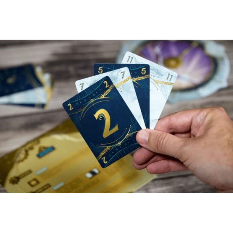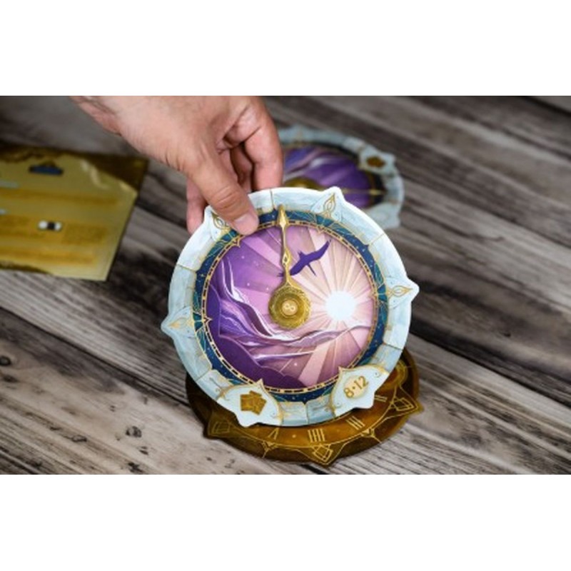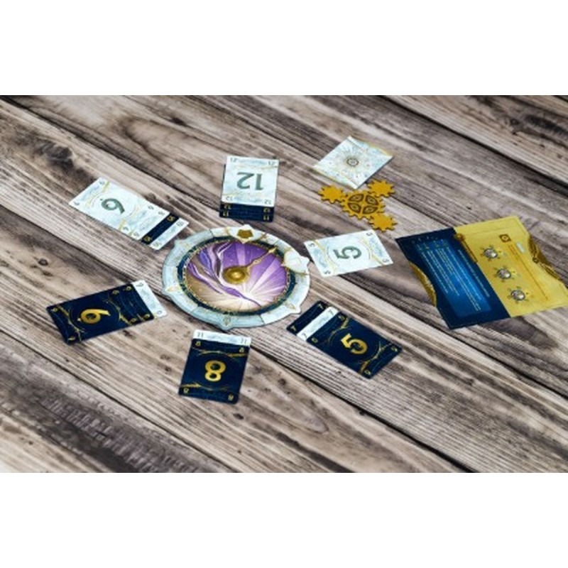 Contenu : 10 étuis Chapitre contenant chacun 4 horloges et 1 feuille de règles, 12 cartes Solaire et 12 cartes Lunaire, 3 jetons Rappel, 3 jetons Bonus, 1 étui Renaissance comprenant 1 horloge Renaissance, 1 aiguille des secondes et 6 jetons, 1 étui Regrets, 1 aiguille et un livret avec les règles du jeu dans une boîte cartonnée.