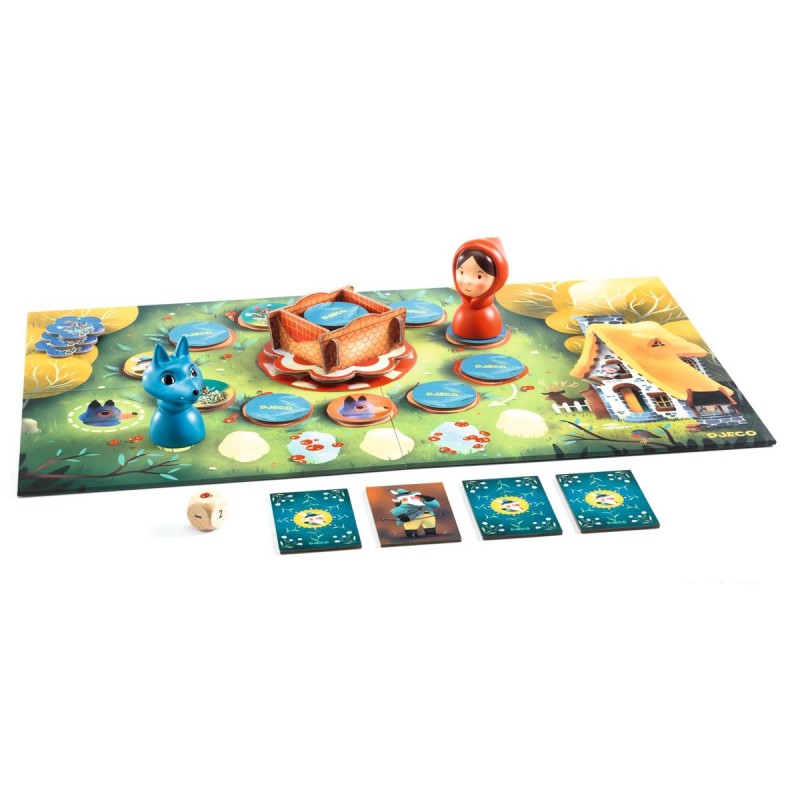 Contenu : 1 plateau de jeu, 2 personnages (1 chaperon rouge et 1 loup), 1 dé, 1 panier, 11 tuiles rondes, 5 tuiles en forme de fleurs + 4 tuiles Chasseur et les règles de jeu dans une boîte cartonnées de format 27 x 30 x 4 cm.