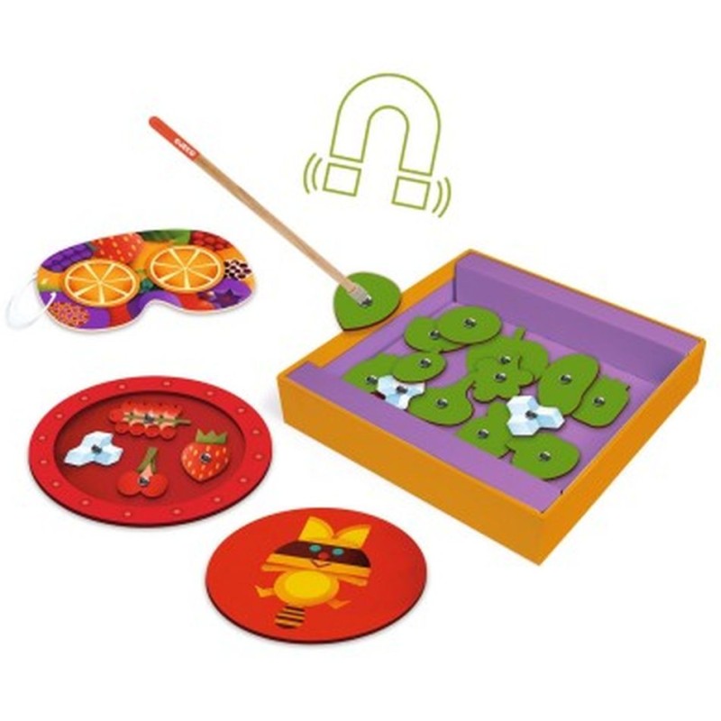 Contenu : 1 baguette magnétique, 3 assiettes, 3 couvres assiette, 4 bandeaux cache yeux avec élastique, 30 tuiles (15 fruits et 15 sucres) avec un rivet métallique au centre, les règles du jeu dans une boîte en carton de format 21 x 21 x 4 cm.