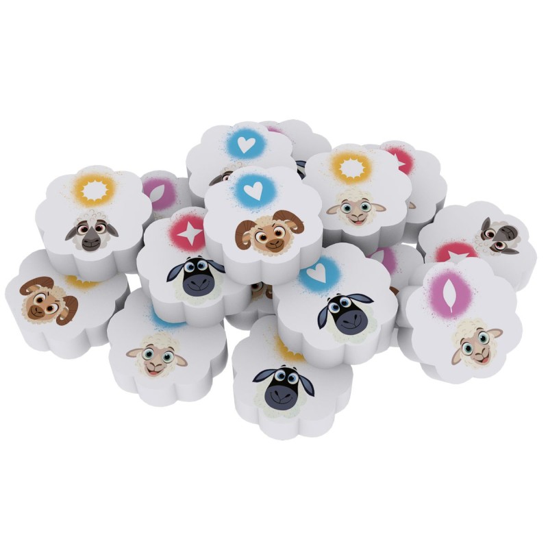 Contenu : 48 jetons Brebis, 4 jetons Mémé Brebis, 4 jetons Petit Agneau, 4 plateaux de jeu recto verso, 2 dés dns une boite cartonnée de format 23,5 x 23,5 x 4 cm.