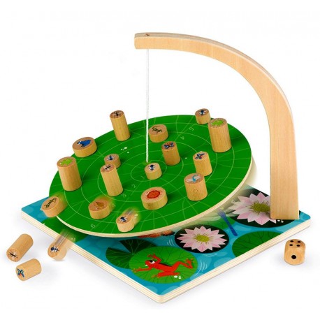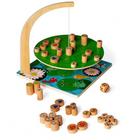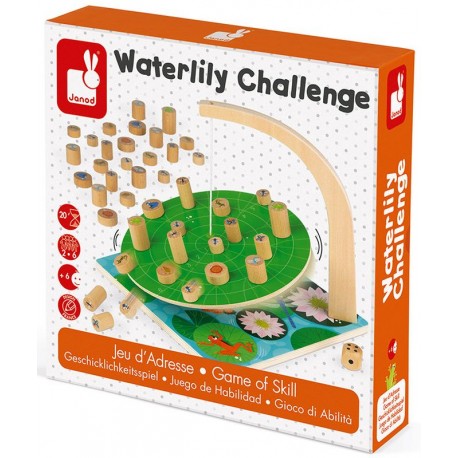 Superbe jeu d'adresse en bois. Chaque joueur à son tour lance le dé qui désigne la zone du nénuphar sur laquelle il doit poser le pion de son choix. Les pions sont de différentes tailles et il faut bien le choisir en fonction de l'équilibre du plateau. Le pion peut être posé directement sur le nénuphar, à cheval entre deux pions ou sur un pion. Si un joueur fait basculer le nénuphar et que les pions tombent, il a perdu! Le jeu est beau, facile à mettre en place et requiert habileté, finesse, concentration et stratégie!