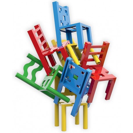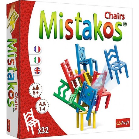 Jeu d'adresse et de dextérité avec des chaises à empiler. Chaque joueur choisit un ensemble de chaises d’une même couleur. Toutes les chaises sont différentes de par la forme des pieds, du dossier et de l’assise. Chaque joueur à son tour sélectionne une de ses chaises et l'ajoute à la structure. Seule la première chaise peut toucher la table. Si un joueur fait tomber des chaises, il les prend dans son jeu. Le gagnant est le premier à ne plus avoir de chaises. Mistakos est un jeu immédiat, pour jouer seul ou à plusieurs, qui sollicite la motricité fine et la coordination.
