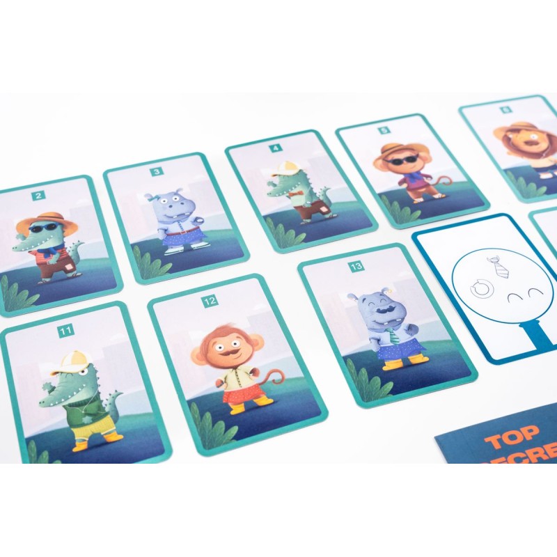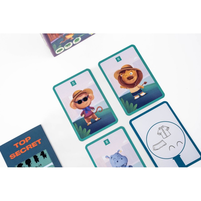 Suspecto propose 18 enquêtes différentes, toutes basées sur l’observation et la discrimination visuelle : « Qui a mangé tous les bonbons ? », « Qui n’a pas fini ses brocolis ? » ou encore « Qui ne veut pas prendre sa douche ? ». Pour commencer, il suffit de choisir une carte Enquête, de la glisser dans l’étui « Top secret » et de disposer les cartes Suspects au centre de la table.