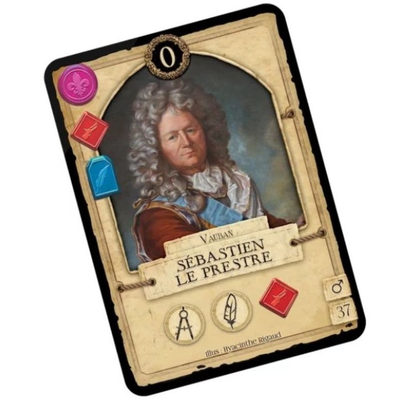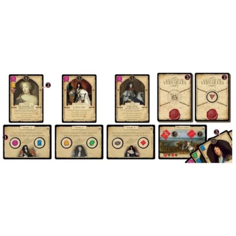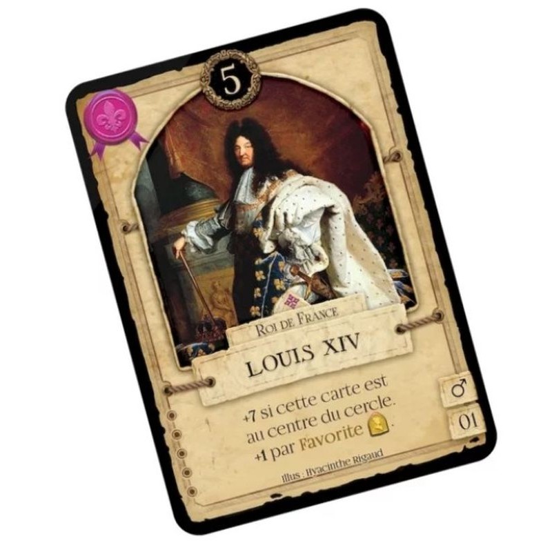 Chaque carte Personnage représente une figure emblématique de l’époque et comporte plusieurs informations : nom, fonction, groupe d’influence auquel elle appartient (noblesse, clergé, hommes d’État, favorites, érudits…), des points de victoire, ainsi que des effets immédiats ou différés. Ces effets se déclenchent selon la position de la carte dans le tableau final de 3 x 3 et en interaction avec les cartes voisines, ce qui rend chaque placement déterminant dans la construction du réseau d’influence. En parallèle de la construction de leur réseau d’influence, les joueurs vont également tenter d’attirer à eux les Grandes Figures de la Cour, accessibles en fonction du nombre de cachets de cire collectés sur les cartes Personnage. Ces personnages prestigieux apportent des bonus et des points de victoire supplémentaires.