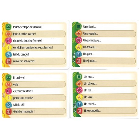 Jeu de mimes farfelu pour des parties pleines de fous rires. Les joueurs se partagent en 2 équipes. Un joueur tire une carte personnage et une carte action. A l'aide de mimes et de bruits il va faire deviner à son équipe quel est son personnage et ce qu'il fait (Je suis un "crabe" et "je conduis un camion les yeux fermés"). Les membres de l'équipe peuvent faire plein de propositions. Si les cartes sont devinées avant la fin du sablier le joueur tire d'autres cartes. Il y a 6 personnages et 6 actions par carte. Les 3 premiers sont plus faciles et appropriés pour les enfants.