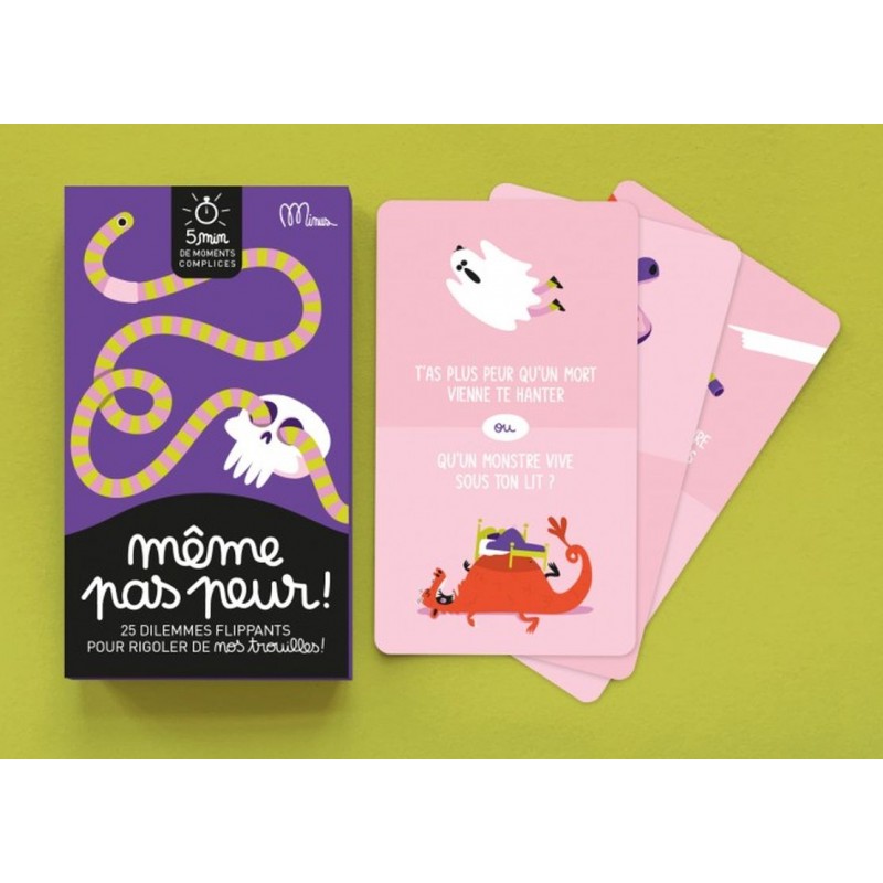 Même pas peur ! Ce sont 25 dilemmes qui permettent d'aborder nos peurs avec humour : idéal pour mieux les comprendre et les mettre à distance… Alors "t'as plus peur de te perdre dans la forêt ou dans la foule, des turbulences en avion ou d'énormes vagues en bateau, de mourir ou de souffrir toute ta vie, d'aller à l'école en pyjama ou de sortir habillée par ta mère ?