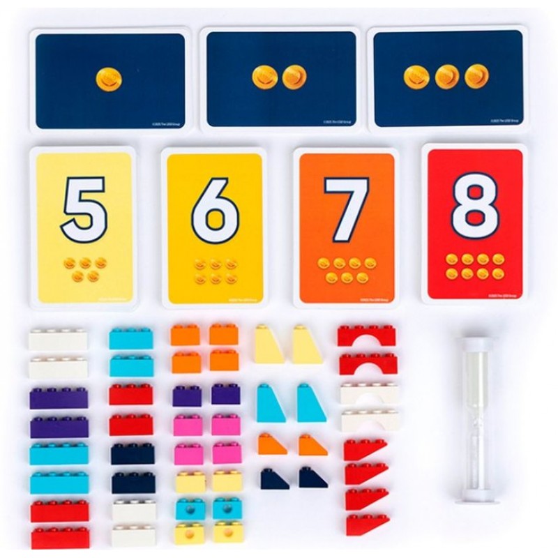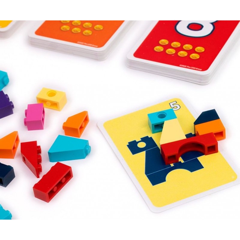 Contenu : 48 briques LEGO, 92 cartes Modèle, 20 cartes Défi, 1 sablier et les règles du jeu dans une boîte cartonnée (16 x 23 x 5 cm).