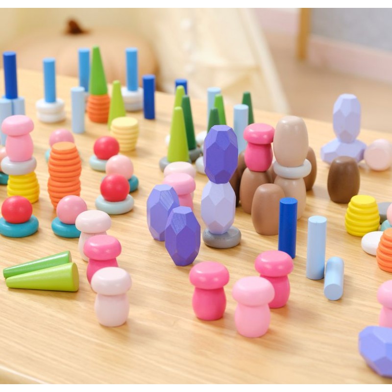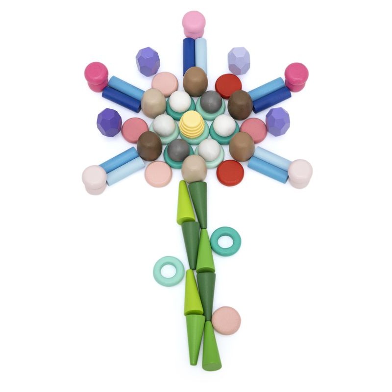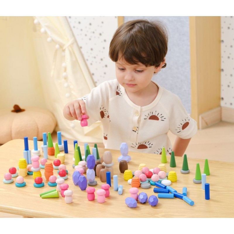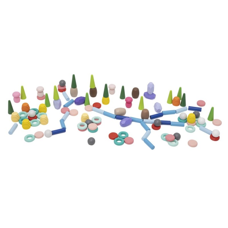 Ce coffret de 141 éléments en bois, inspirés de la nature (en forme de champignons, de pierres, d’arbres ou encore de galets) et déclinés en différents camaïeux de couleurs, offre un large éventail d’activités. Les enfants peuvent réaliser des tris par formes ou par couleurs, construire des structures variées et laisser libre cours à leur imagination et à leur créativité. Ce matériel sollicite la motricité fine et la coordination œil-main.