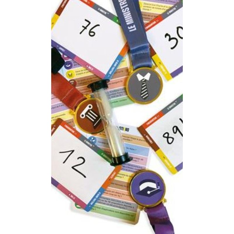 Contenu : 1 400 questions réparties dans 9 catégories, 9 médailles, 4 ardoises, 4 stylos effaçables, 1 sablier, 1 règle du jeu dans une boîte cartonnée (28 x 22 x 5 cm).