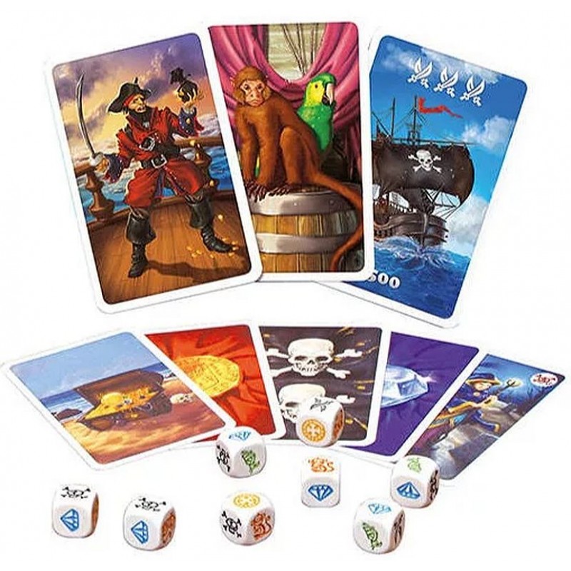 Contenu: 35 cartes Pirates, 5 cartes Résumé, 8 dés Corsaires, règles.