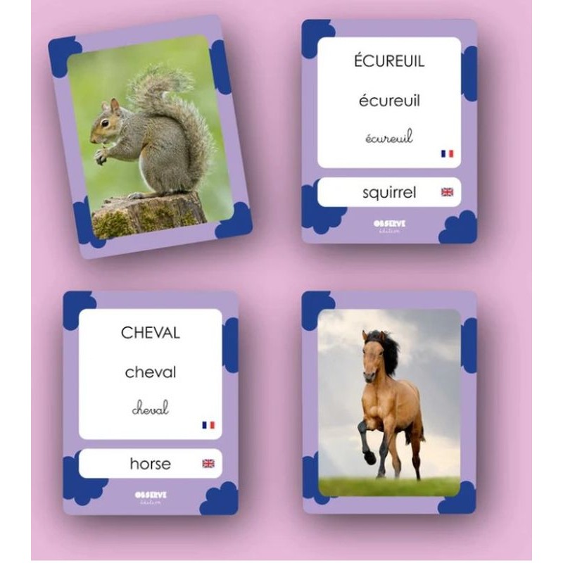 Chaque carte présente au recto une photo réaliste d’animal, et au verso le mot correspondant écrit en capitale, en script et en cursive. Ce matériel aide les enfants à enrichir leur vocabulaire et à se familiariser progressivement avec les lettres et les différentes formes d’écriture. Des cartes qui accompagnent pas à pas l’enfant vers la lecture et l’écriture tout en consolidant le vocabulaire animalier.