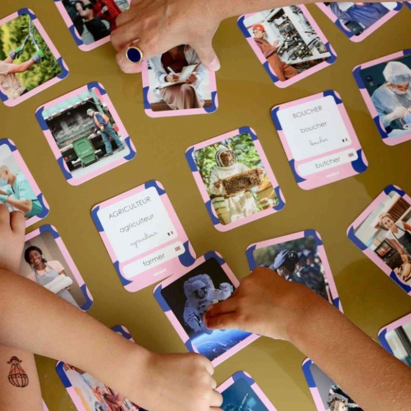 Chaque carte présente au recto une photo réaliste d'un métier, et au verso le mot correspondant écrit en capitale, en script et en cursive. Ce matériel aide les enfants à enrichir leur vocabulaire et à se familiariser progressivement avec les lettres et les différentes formes d’écriture. Des cartes qui accompagnent pas à pas l’enfant vers la lecture et l’écriture tout en consolidant le vocabulaire autour des métiers.