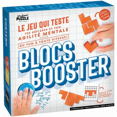 Jeu de logique et de rapidité pour 1 à 4 joueurs. Chaque joueur prend une grille et 8 blocs de bois. On place les cartes challenges au centre de la table, en formant 4 piles séparées. Elles correspondent à 3 types de challenge avec 4, 6 et 8 blocs à positionner et une pile de challenges mystères. On retourne une carte modèle sur la table. La première personne qui estime avoir reconstitué la forme exacte sur sa grille tape sur la sonnette. Si la réalisation est bonne, le joueur gagne la carte. Plus il y a de blocs à placer, plus le challenge est corsé! Dans un premier temps les joueurs peuvent s'entrainer tranquillement chacun de leur côté!