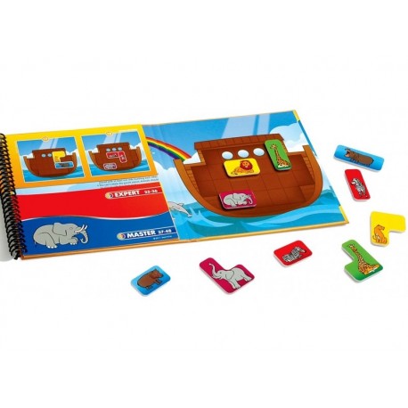 Jeu de logique à emporter partout. On place les pièces dans l'arche comme indiqué sur un défi. On doit ensuite positionner tous les autres animaux dans l'arche, de sorte que les animaux de couleur identique se touchent et qu'ils aient tous la tête en haut. Il n'y a qu'une solution par défi.