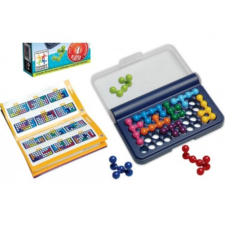 Jeu de réflexion logique en format de voyage à transporter partout! On choisit un défi et on place les pièces dans l'espace de jeu de la boîte, comme indiqué sur le modèle. Les barrettes de perles ont des ergots que l'on insère dans les trous du support de jeu. On doit ensuite compléter le plateau avec le restant des pièces. La surface de la mosaïque obtenue doit toujours être lisse. Plus on avance dans les défis, moins il y a d'indices.