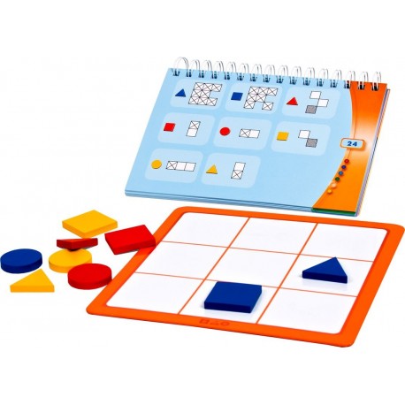 Contenu: 1 grille en carton épais (20 x 20 cm) + 9 pièces en bois (3 carrés, 3 cercles, 3 triangles en 3 couleurs) + 1 livre de 80 grilles défis + solutions + règle.