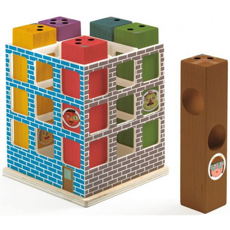 Contenu: 1 cube immeuble en plastique sur un socle en bois avec 4 faces de couleurs différentes (7,6 x 7,6 x 9,4 cm), 6 bâtonnets avec les personnages en bois (ht. 9,6 cm), 30 cartes réversibles pour 60 défis de difficulté croissante (8,5 x 10,5 cm), livret avec la règle et les solutions, dans une boîte cube de format 11,5 x 11,5 x 12,6 cm.