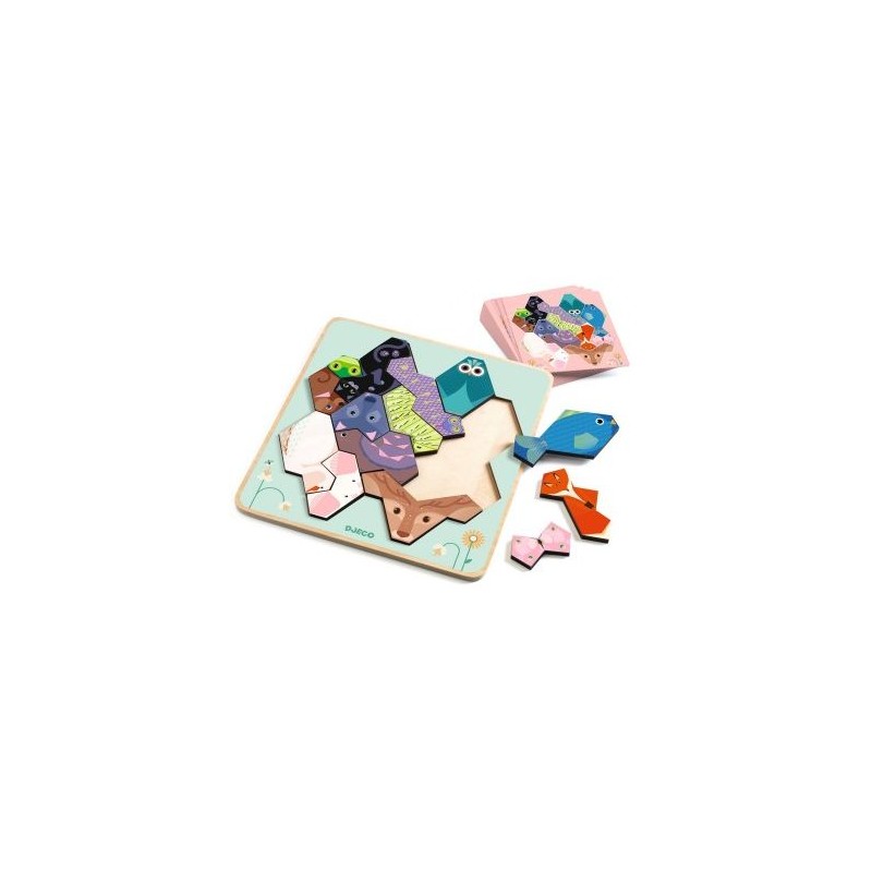 Contenu : 1 plateau de jeu en bois, 14 pièces en bois représentant des animaux, 12 cartes-modèles, 1 livret de règles du jeu dans une boîte cartonnée (21 x 21 x 4 cm).