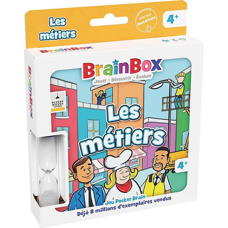 Jeu d'observation et de mémoire visuelle sur le thème des métiers quotidiens ou extraordinaires. Un joueur observe l'illustration d'une carte pendant que le sablier se vide. Puis il donne la carte à un autre joueur et jette le dé. Il doit ensuite répondre à la question indiquée par le dé: "Certains journalistes portent-ils une cravate?". Si la réponse est bonne la carte est gagnée! Au bas de chaque carte on trouve une question ouverte sur la profession qui permet d'ouvrir la discussion. Ce jeu d'attention et de mémoire est modulable et facile à utiliser, dans un format à emporter partout.