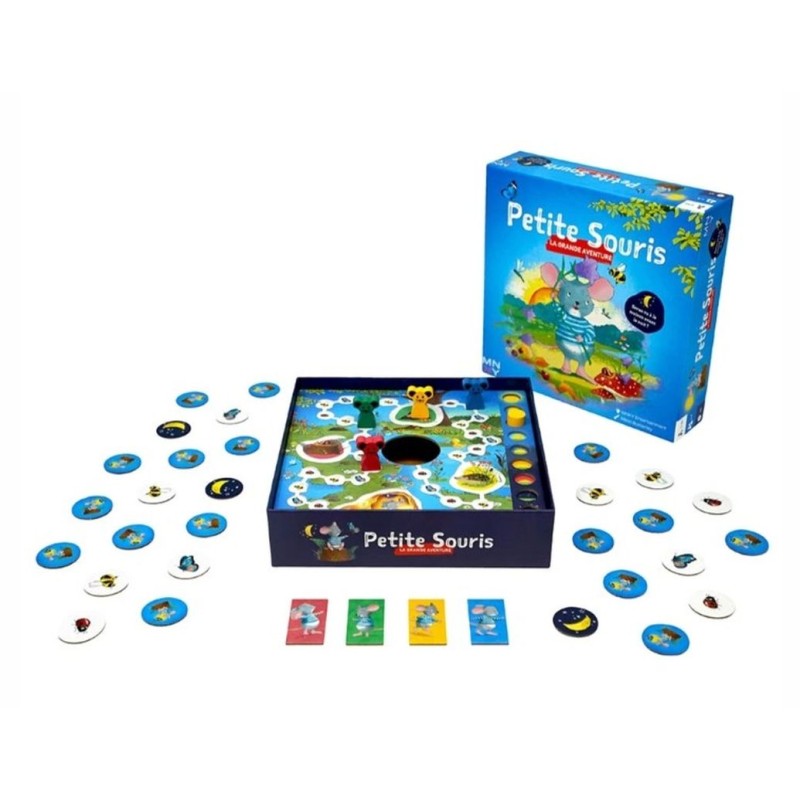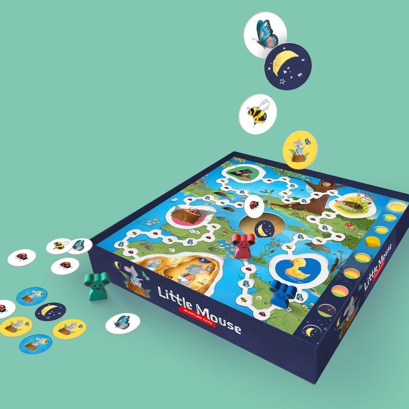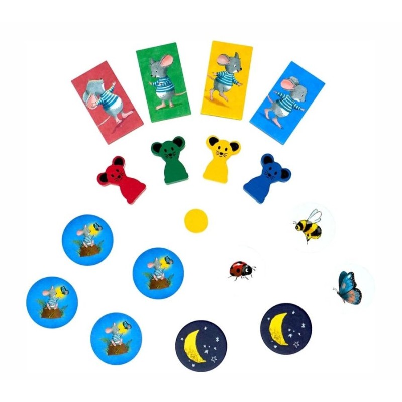 Jeu de parcours et de mémoire. Les joueurs incarnent des petites souris qui doivent rentrer chez à la maison avant que la nuit ne tombe, à partir de 3 ans.