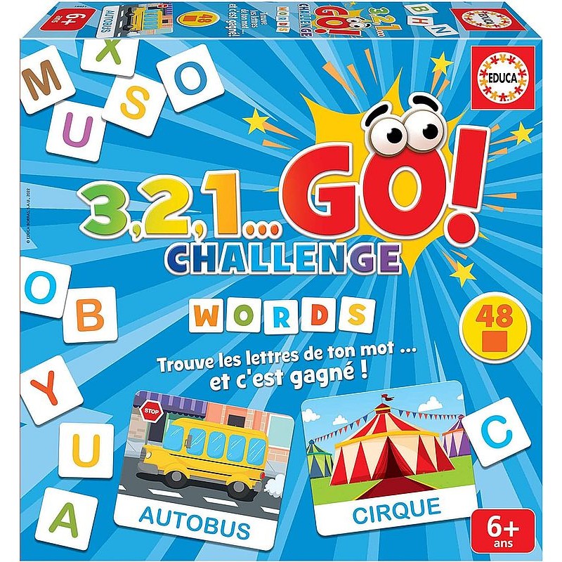 Contenu: 150 jetons lettres (2,6 x 2,6 cm), 48 cartes mots (6,5 x 7,6 cm), règles, dans une boîte de format 5,5 x 24,8 x 24,8 cm.
