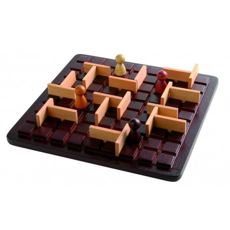Contenu: 1 plateau en bois (17 x 17 cm) sur lequel figurent 81 cases en relief, 20 barrières en bois, 4 pions en bois, règle.