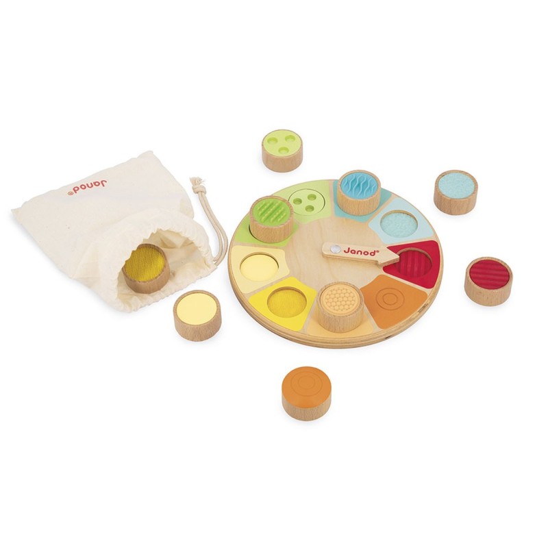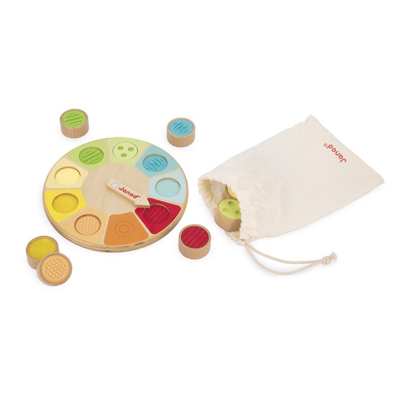 Contenu : une roue tactile, 9 pièces en bois, 1 sac en coton dans une boîte de format 19 x 2 x 19 cm.