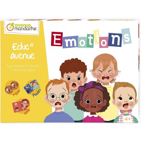 Ensemble de 3 jeux sur le thème des émotions. Pour le loto on dispose d'une émotion par planche: la joie, la colère, la peur et la tristesse. Il s'agit de placer les tuiles avec des visages d'enfant sur les visages identiques des planches. Avec le jeu de mémory chaque animal présente une émotion différente (content, triste, fier, surpris, peiné, heureux, en colère, amoureux). Les puzzles associent une situation à une émotion: Je suis tombé, je pleure ou Je mange du gâteau, je suis content, etc. Des jeux simples, de grande taille et solides, parfaits pour des ateliers autour des émotions à l'école maternelle.