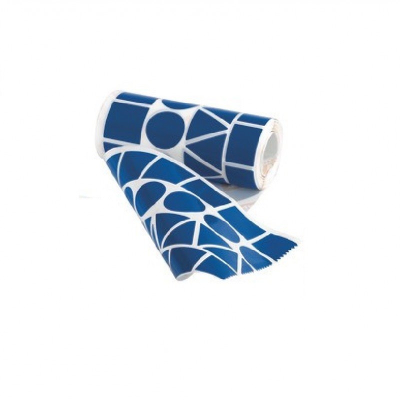 Rouleau de gommettes de diverses formes de couleur bleu avec un adhésif permanent.