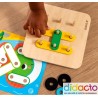 Support en bois avec des pièces à enfiler librement ou selon des modèles. Il y a plusieurs modes de jeu. L'enfant peut créer ses propres figures. Il peut utiliser les fiches avec des dessins. On les place sur le support de jeu (ou à côté) et l'enfant enfile les pièces en bois pour recouvrir les formes en blanc, en respectant les formes. Il y a enfin les modèles de lettres, de chiffres et de figures géométriques en taille réduite que l'enfant peut recréer sur le support de jeu. Ce jeu favorise la coordination œil-main, la dextérité et le repérage spatial.