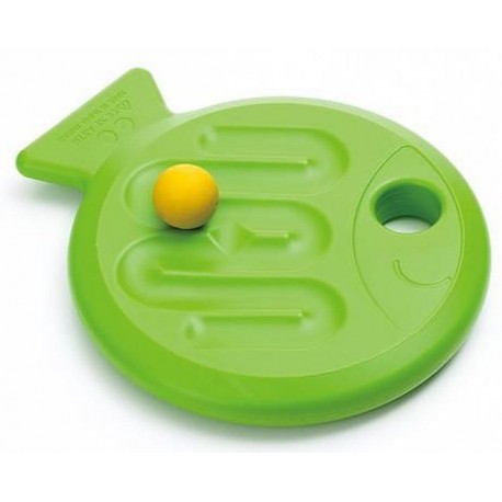 Un magnifique poisson pour un labyrinthe de motricité réversible. Sur un côté une petite boule roule le long d'un chemin derrière un couvercle en plexiglas. La balle ne peut pas tomber et le joueur doit incliner le poisson pour la faire circuler. Une balle plus grosse sert d'oeil au poisson. On peut l'enlever et l'utiliser pour la faire circuler sur l'autre face du poisson, avec plus de précaution car elle peut tomber. Un jeu avec deux niveaux de difficulté pour travailler la coordination œil-main et renforcer la flexibilité des poignets et des muscles de la main.