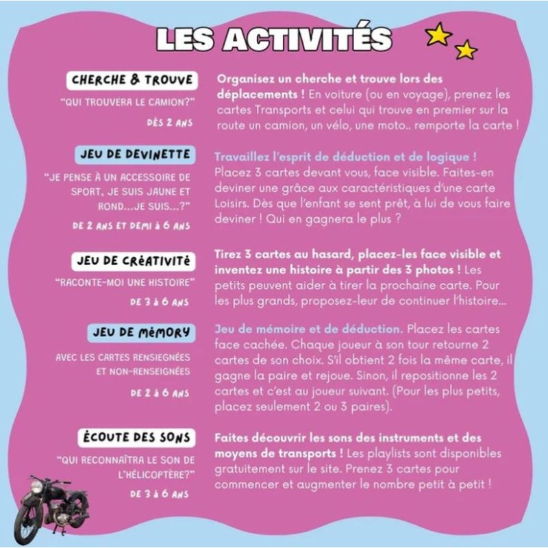 Le coffret Mini Mundy – Loisirs se compose de 2 séries de 30 cartes : une première avec uniquement les visuels, une seconde avec les visuels accompagnés du nom écrit, ainsi que 30 étiquettes comportant uniquement les mots. On dispose ainsi de 3 types de supports complémentaires : image seule, image + mot, et mot seul. Les cartes présentent de véritables photographies, permettant une représentation fidèle de l'activité de loisir et facilitant le lien avec le quotidien des enfants.
