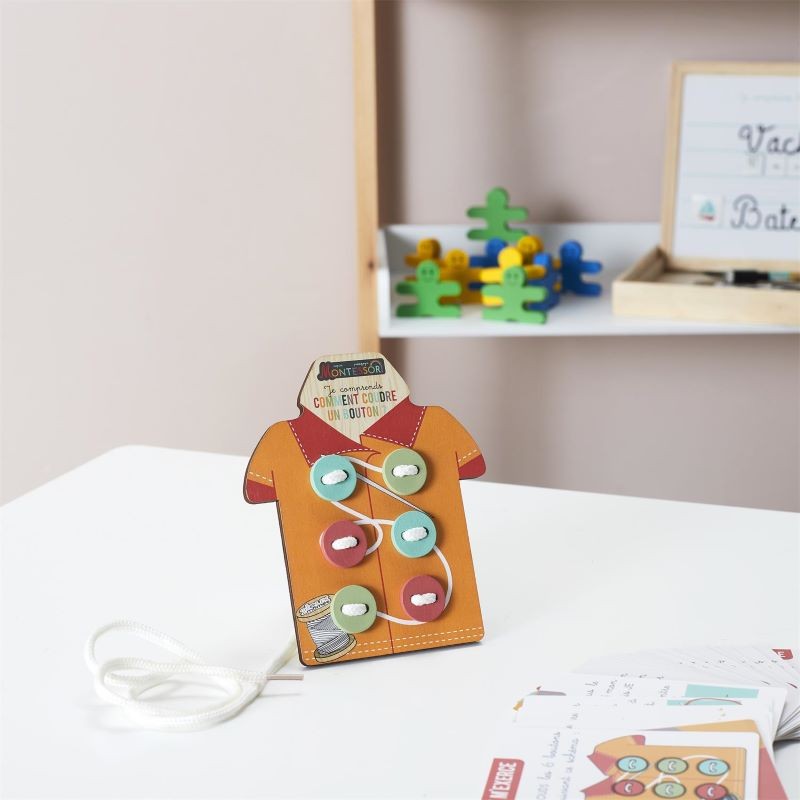 Un jeu pour apprendre à coudre des boutons. Grâce à son support de couture, l'enfant pourra s'amuser à coudre et découdre des boutons en suivant les indications présentes sur les cartes. Le jeu suit un système de progression étape par étape pour que l'enfant puisse bien comprendre et analyser ce qu'il est en train de faire. Il y a trois types de cartes dans le jeu : les "je comprends", les "je m'exerce" et les "astuces" pour bien accompagner la découverte du monde de la couture. Un matériel attractif qui sollicité la motricité fine.