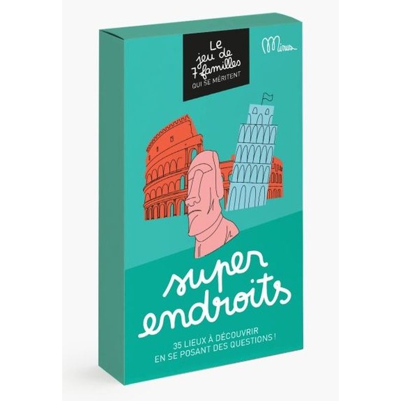 Ce jeu reprend les bases du jeu des 7 familles, mais pour gagner une carte, le joueur ne se contente pas de la demander : il doit ensuite répondre à une question de la carte – un QCM rigolo ou une question ouverte plus pointue. Ce jeu se compose de 7 familles de 5 lieux emblématiques dans le monde (les tours, les ponts, les musées, les châteaux…). Un jeu simple et nomade qui transforme un classique en moment d’apprentissage et de complicité.