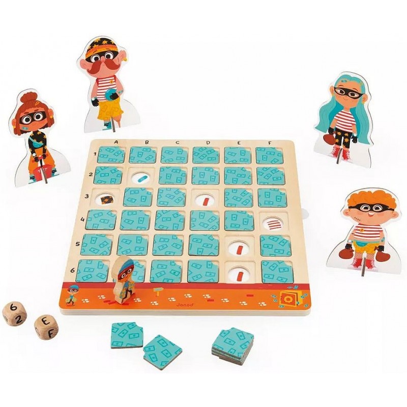 Jeu de déduction coopératif pour déjouer les mauvaises intentions du bandit! On place des tuiles dans chaque alvéole du plateau de jeu et on glisse secrètement une planche d'indices à l'intérieur. Les 6 bandits sont à côté du plateau de jeu. Chaque joueur à son tour jette les dés lettres et chiffres qui indiquent, à la manière d'un tableau à double entrée, la tuile que l'on peut enlever. Si on découvre un indice (des rayures, des gants, des lunettes, etc) on retire les suspects qui ne portent pas ce détail. S'il s'agit d'un bâton de dynamite, le voleur avance vers le coffre-fort. Pour gagner il faut démaquer le suspect avant que le bandit atteigne le coffre. Un jeu original et bien conçu, qui fait appel à la réflexion, au sens de l'observation et à la logique!
