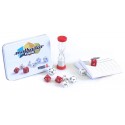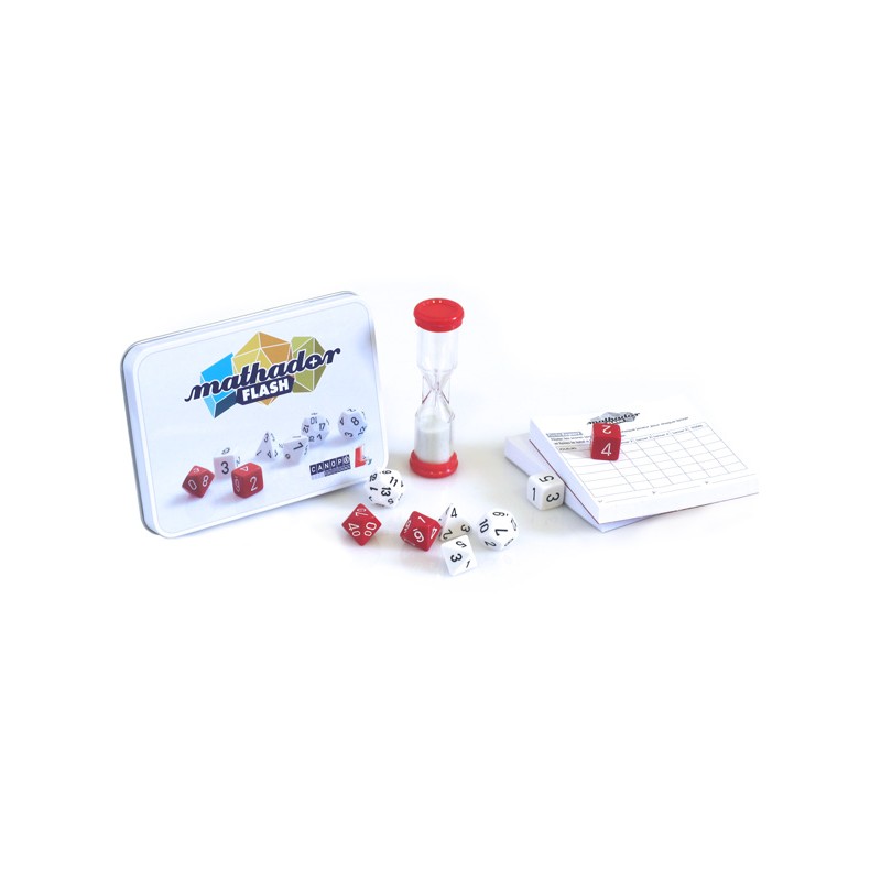 Jeu de calcul mental rapide et amusant. On jette les 2 ou 3 dés rouges qui vont désigner le résultat à obtenir (entre 10 et 69 ou entre 0 et 90). On jette ensuite les 5 dés blancs. Tous les joueurs en même temps cherchent à combiner les dés pour obtenir le résultat. Chaque nombre ne peut être utilisé qu'une fois et les 4 opérations sont possibles. Suivant l'objectif recherché ce sera le plus rapide qui marquera le point ou tous les joueurs ayant trouvé une bonne réponse en un temps donné. Jeu facilement modulable dans le temps et en fonction du niveau des joueurs!